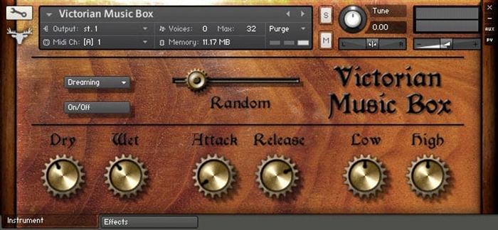 Victorian Music Box is a multi-sampled antique music box for Kontakt. The sound is dark and mysterious, perfect for a cinematic style. The instrument is very tweakable with attack/release and low/high EQ controls. Included is a convolution reverb effect with a selection of unusual impulses. The winding-up sound and the mechanical ‘whir’ are also included in the library.