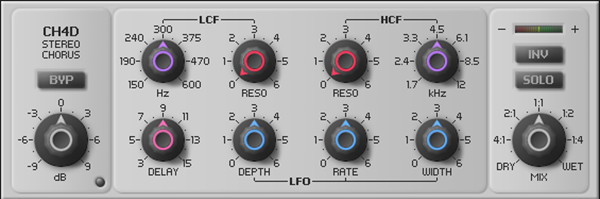Classic chorus effect with four delay taps, two per L/R channel, and adjustable resonant cut filters. Each delay tap is modulated by advanced LFO which has less obvious repetitive effect on processed signal than basic oscillator shapes.