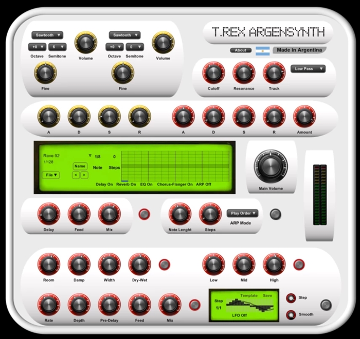 T. Rex Bass is a bass synthesizer with built-in arpeggiator and step LFO. Effects modules let you control the reverb, delay and an equalizer.