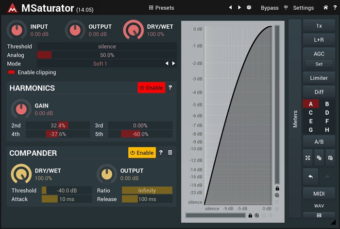 MSaturator performs smooth saturation in a definitive tube-like way improving the clarity of the resulting sound. Its excellent sound quality makes it flexible enough to double as a distortion module for guitars and other instruments.