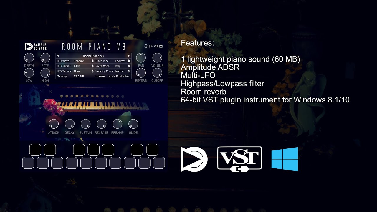 Room Piano is a light piano plugin for musicians who want to add a lo-fi touch to their tracks. The living room piano has been sampled in 2 velocities every 3 semitones to keep it CPU friendly. The plugin is based on an upright acoustic piano 24-bit stereo recording.